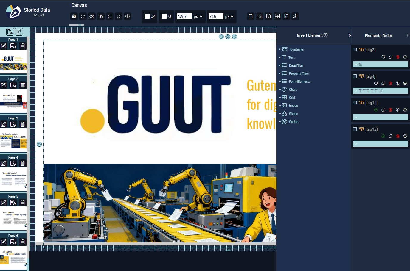 Users want to create naturally – just drag-and-drop to design on a live canvas with help from AI when needed. They can build stunning presentations, reports, dashboards, brochures, catalogues, and more with distinct UI/UX and other functionality. GUUT gives users the creative power that once took entire teams of specialists.